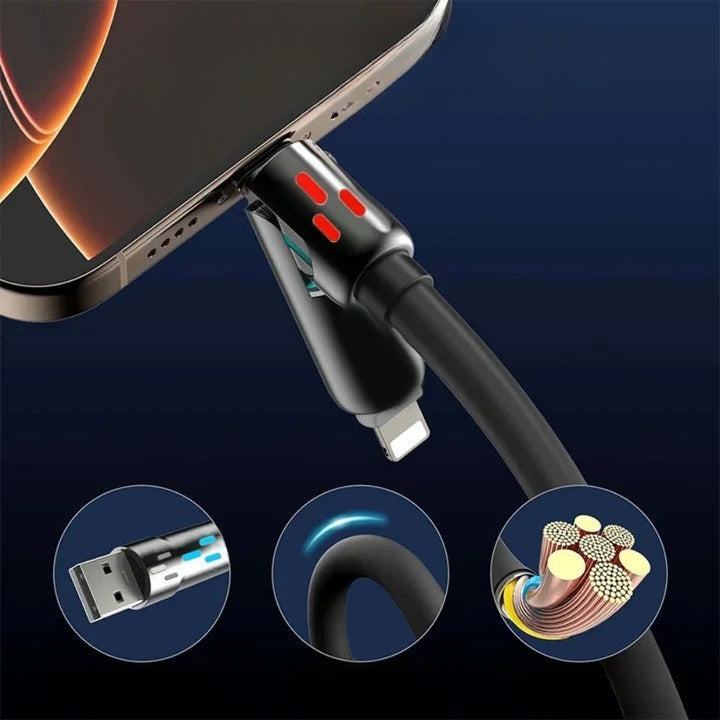 Deze kabel vervangt vier verschillende oplaadkabels en voorkomt volledig dat je kabels in de knoop raken. Voorzien van meerdere aansluitingen – USB-A, Lightning en twee USB-C poorten – waardoor hij werkt met laptops, telefoons, tablets en oordopjes.